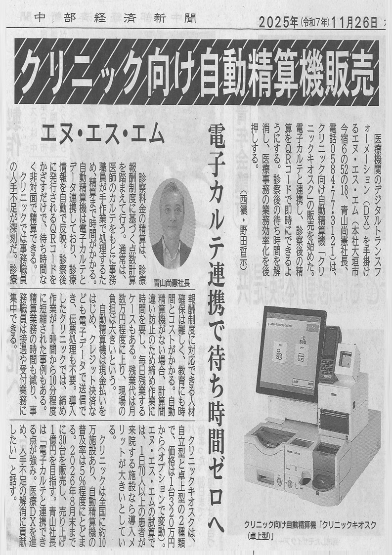 2025年11月26日付の中部経済新聞において、当社が提供するクリニック向け自動精算機が紹介されました。